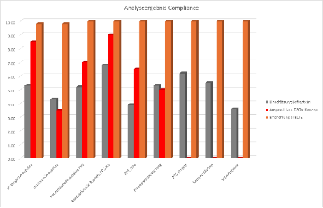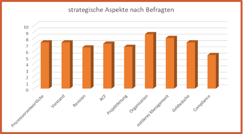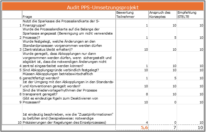 Die Befragten versehen ihre Antworten mit einem Punktwert und haben zusätzlich die Möglichkeit verbale Anmerkungen und einen gewünschten Idealzustand zu benennen. Die Befragungsgruppen können Sie natürlich großteils selbst bestimmen, wir empfehlen aber mindestens eine Befragung von Prozessmanagement, Vorstand, Revision und Prozessverantwortlichen. Weitere Personen können beispielsweise Vertreter des mittleren Managements oder Beauftragte sein.